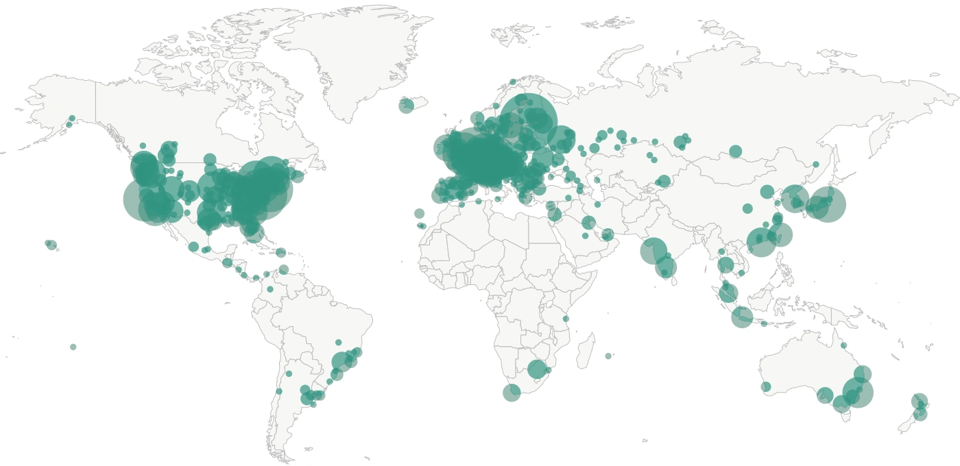 This image shows the worldwide distribution of Bitcoin Nodes.
