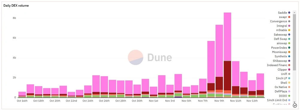 Volume on the largest DeFi trading platform Uniswap ($UNI) saw volume pass $20 billion in the week after the collapse, becoming the 2nd largest exchange for ETH transactions by volume, temporarily doubling the volume on Coinbase.