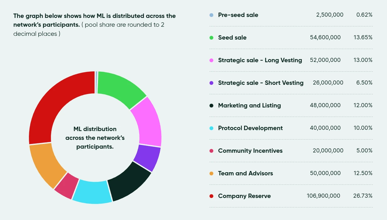 The initial unlocked token supply at the TGE is 15,820,000 ML. The rest of the ML tokens are subject to vesting schedules of different lengths. After two years, approximately 335,000,000 ML tokens will be unlocked.